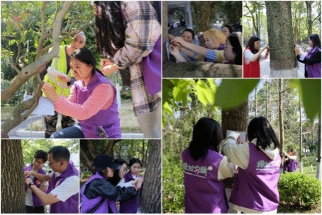 活动现场,师生们分为3个小组,分别从校园南区、北区和中区集合出发,在专业人员的指导下,严格按照规范操作:精准核对树木信息,确保标牌与植株一一对应;采用弹簧绳科学固定,避免损伤树皮。穿梭林间,大家分工协作、默契配合,边挂牌边交流植物知识,现场氛围热烈而有序。