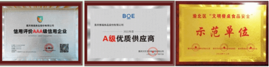 公司获得中国团体供餐十大领军企业、重庆市优秀团餐企业、渝北区餐饮服务食品安全示范单位、重庆市标准化团餐企业等多项荣誉,中央配供中心连续多年通过餐饮服务食品安全检查A级评级,参与制定重庆市集体用餐配送服务规范地方标准(DB50 T 1533-2023),成为行业领先标杆企业。